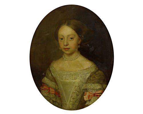 | Portrait of a young lady, half-length, in a green dress with pink bows, and a pearl necklace and earrings | |
