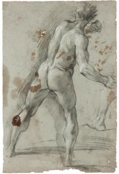 | A STANDING MALE FIGURE, SEEN FROM BEHIND, CLUTCHING A STONE IN HIS RIGHT HAND | |