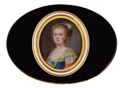 | Enamel on copper, gilt-metal frame with enamel border, later inset in a gold-mounted tortoiseshell box | |