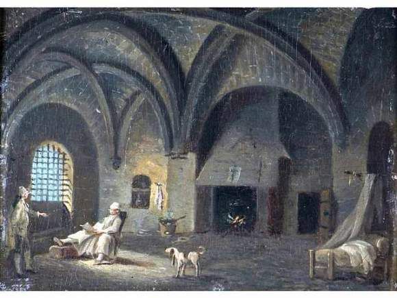 Intérieur de la Conciergerie avec Louis XVI lisant.