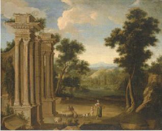 | Bergère et troupeau près d'un portique en ruine, dans un paysage lacustre | |