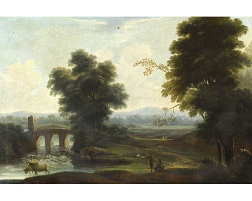 | Peasants grazing their cattle before an Italianate landscape with a bridge in the distance | |
