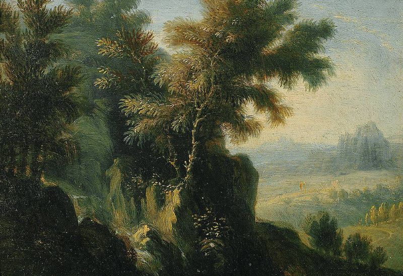 | Felslandschaft mit Katarakt, seitlich Durchblick auf Landschaft mit Personenstaffage. | |