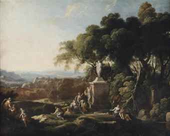 | Females making offerings to a statue of Ceres in a wooded landscape, a village and mountains beyond | |