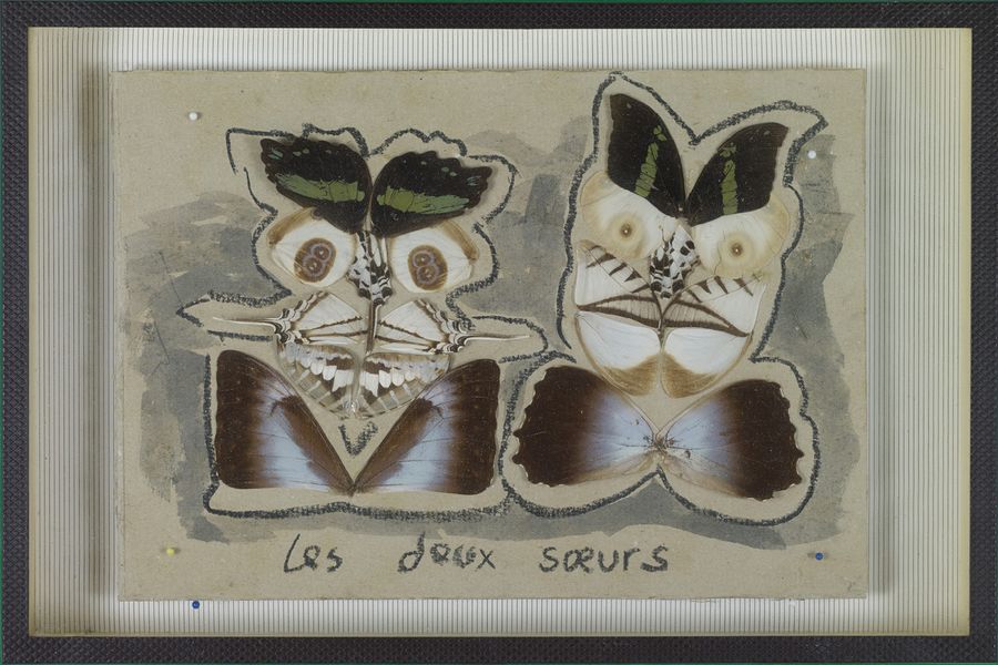 | Mixed Media (butterfly wings, watercolor, charcoal and pins) on cardboard | |