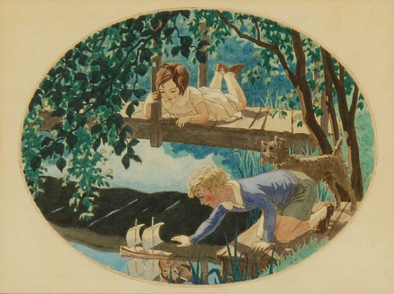 Maiden voyage, depicting a young boy launching a toy sailboat as a young girl looks on