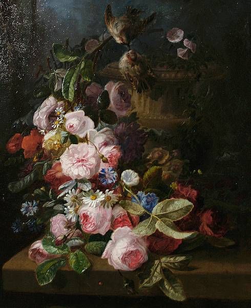 Still life of flowers on a ledge