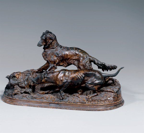 | Setter et braque à l'arrêt devant une perdrix Épreuve en plâtre patiné | |