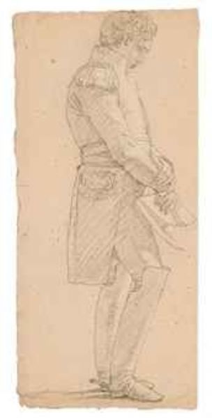 Un officier, de profil à droite, tenant son chapeau bicorne
