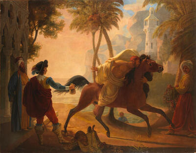 A coastal landscape with a cavalier purchasing an Arab stallion