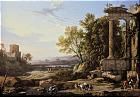 | AN ITALIANATE LANDSCAPE WITH A CATTLE HERDER AND OTHER FIGURES BELOW ROMAN RUINS | |
