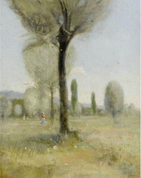 Figures in a field with trees.