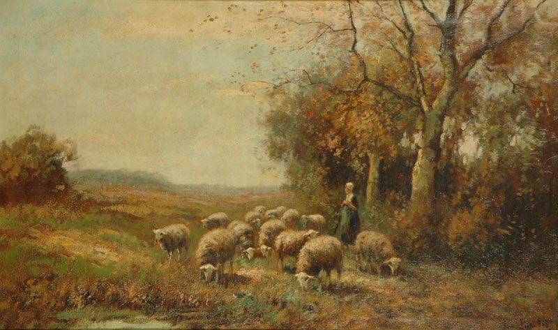 Herderin met kudde schapen