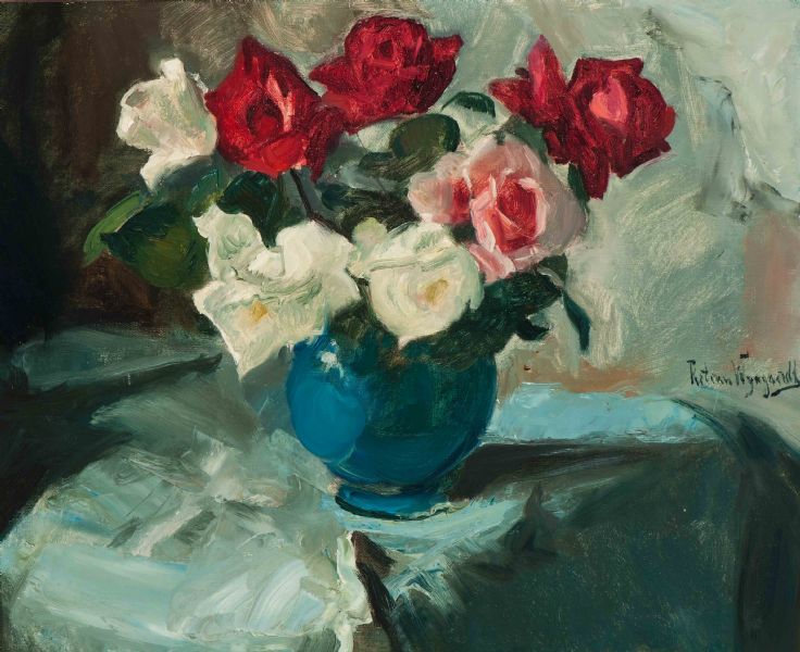 Bouquet rozen in blauw vaasje