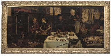 | A kitchen interior, with a couple at a laid table, a servant couple by the fire beside them | |