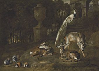 | Three deer, a peacock, rabbits, and guinea pigs in a wooded landscape, with classical statuary and arches beyon | |