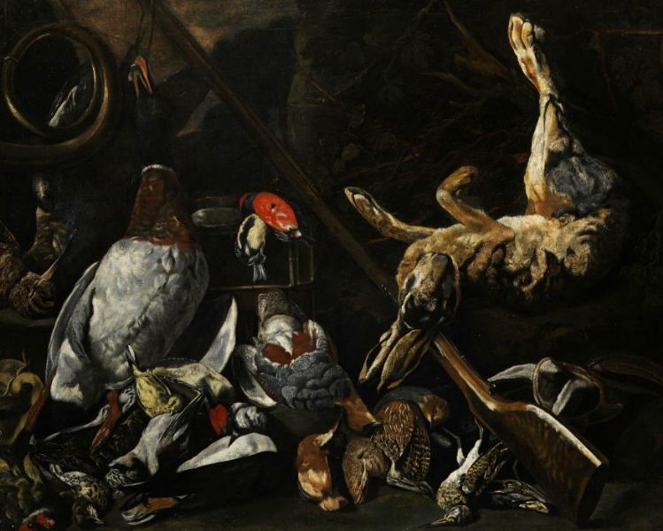 GROSSES JAGDSTILLEBEN MIT ERLEGTEN ENTEN, FELDHASEN UND WEITEREM FEDERVIEH