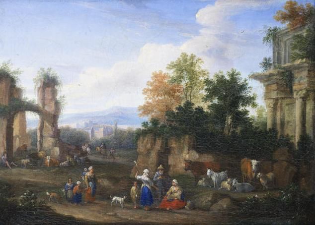 Peasants grazing their cattle in an open landscape, amongst classical ruins