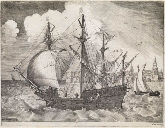 | Man of War Sailing to the Left, in the Background a Town. | |