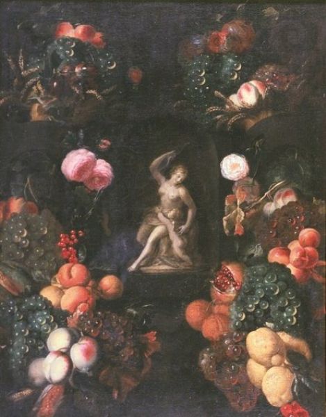 | Bountiful Still Life with Flowers and Fruit Surrounding a Niche with Diana and Cupid | |