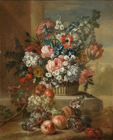 | A basket of tulips, roses, poppies and other flowers on a stone ledge with peaches and grapes in the foreground | |