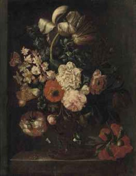 | Roses, tulips and morning glory in an urn on a stone ledge, with a butterfly, a fly and a beetle | |