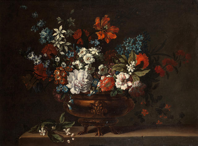 | Chrysanthemums, roses, tulips, orange blossom and other flowers in a bronze urn on a stone ledge | |