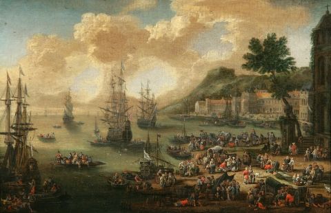 Vue portuaire animée de nombreux personnages