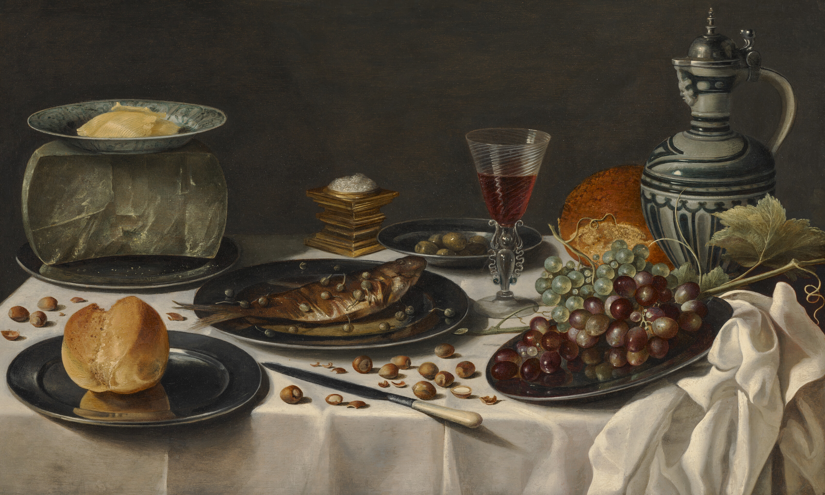 A herring a bread roll and a bunch of grapes on pewter platters with a tazza of red wine a porcelain decanter and a parmesan on a draped table