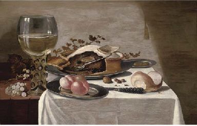 | A pie on a pewter plate, a giant roemer, peaches on a pewter plate, a bread roll and a knife on a partly-draped table | |