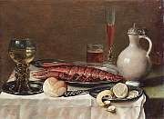 | A roemer of white wine on a silver plate, a bread roll, a lobster on a silver dish, a knife and peeled lemon on a silver plate, | |