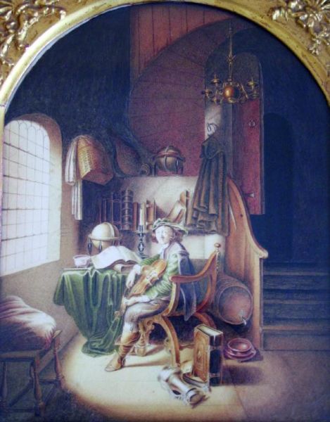 INTERIOR SCENE WITH A GENTLEMAN HOLDING A VIOLA