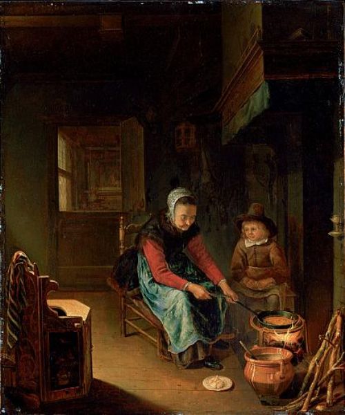 | AN INTERIOR WITH A WOMAN COOKING PANCAKES WITH A YOUNG BOY BEFORE A HEARTH | |