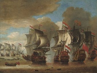 | The Battle of Solebay, 28th May 1672; the English flagship Royal Prince heavily engaged by Dutch vessels on either side of her | |