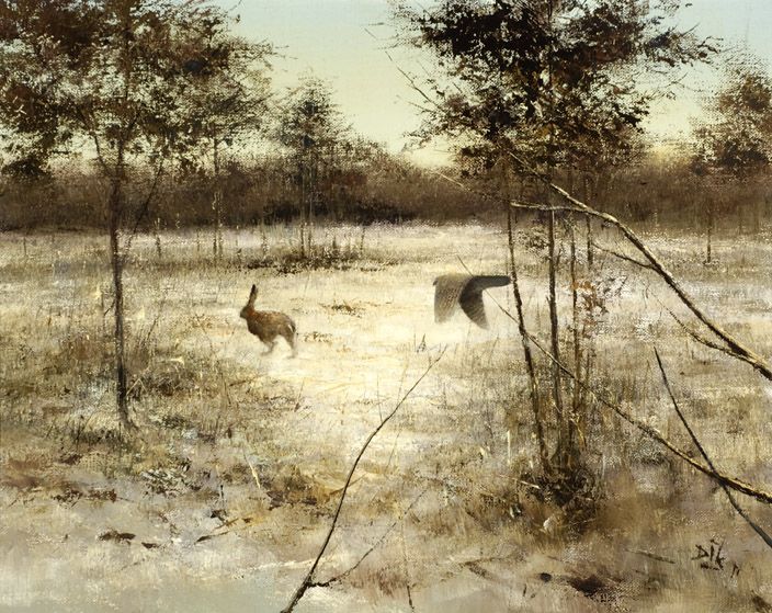 Winter landscape with a hare and an owl