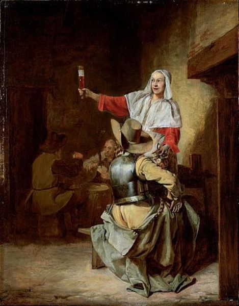 | A TAVERN INTERIOR WITH A SEATED SOLDIER, SEEN FROM BEHIND, WITH A SERVING WOMAN, FIGURES PLAYING CARDS IN THE BACKGROUND | |