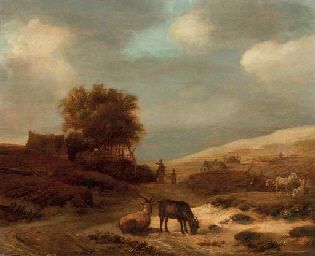 | A dune landscape with goats and sheep, travellers on a track and cottages beyond | |