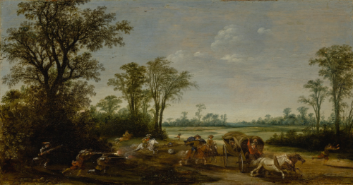 | LANDSCAPE WITH TRAVELERS AMBUSHED ON A ROAD AT THE EDGE OF A FOREST | |