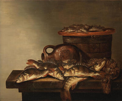 Fish, a fishing basket and net on a table-top