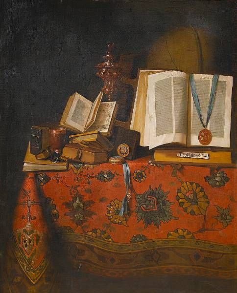 | A Vanitas still life with books, a globe and a silver-gilt beaker and cover, on a table draped with a Turkish carpet | |