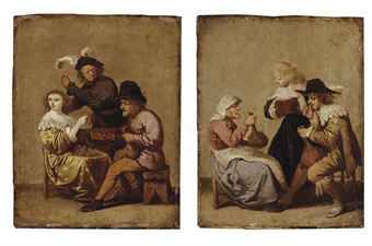 | A drinking peasant courting a young lady with an angry young gentleman nearby; and A gentleman drinking with an old woman, a you | |