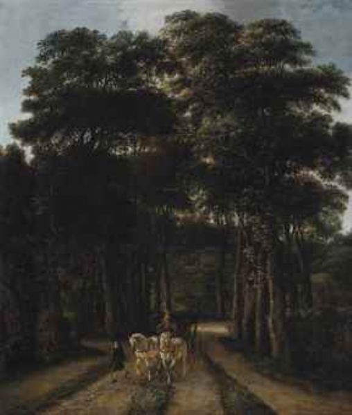 | A wooded landscape with a horse-drawn carriage on a track | |