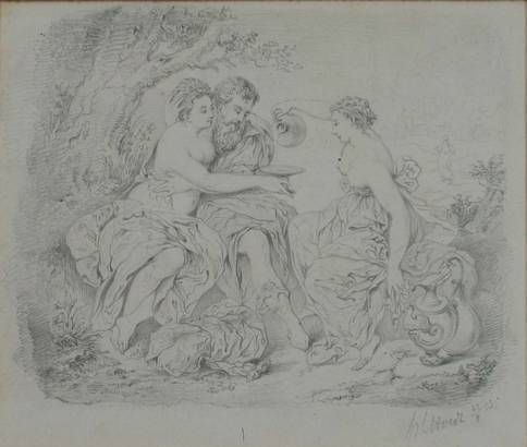 | Classical scene of a maid pouring water for a man and a semi-nude woman seated in embrace under a tree | |
