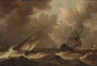 | An English Man-of-War before the wind and a close hauled 'Hoeker', as a storm approaches | |