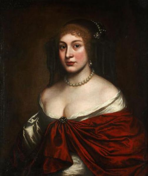 Portrait of a lady, bust-length, in a white silk dress, a red wrap and a pearl headdress