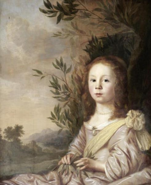 | Portrait of a young girl, three-quarter-length, in a pink silk dress and a yellow sash, holding a laurel branch, seated before a | |