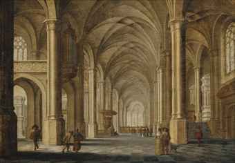 A church interior with elegant figures