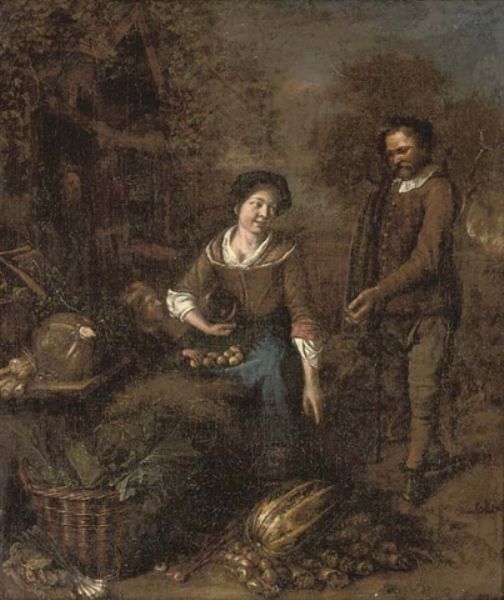 | A wooded landscape with a lady selling fruit and vegetables to a gentleman | |