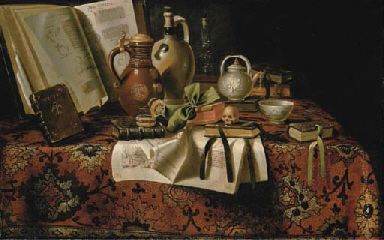 | A vanitas still-life with books, jugs and a skull on a draped table | |