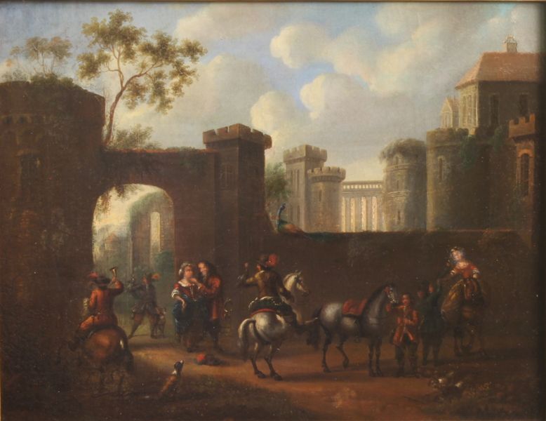 | study of a castle courtyard with figures on horse back in foreground and hunters return within a romanticised landscape | |